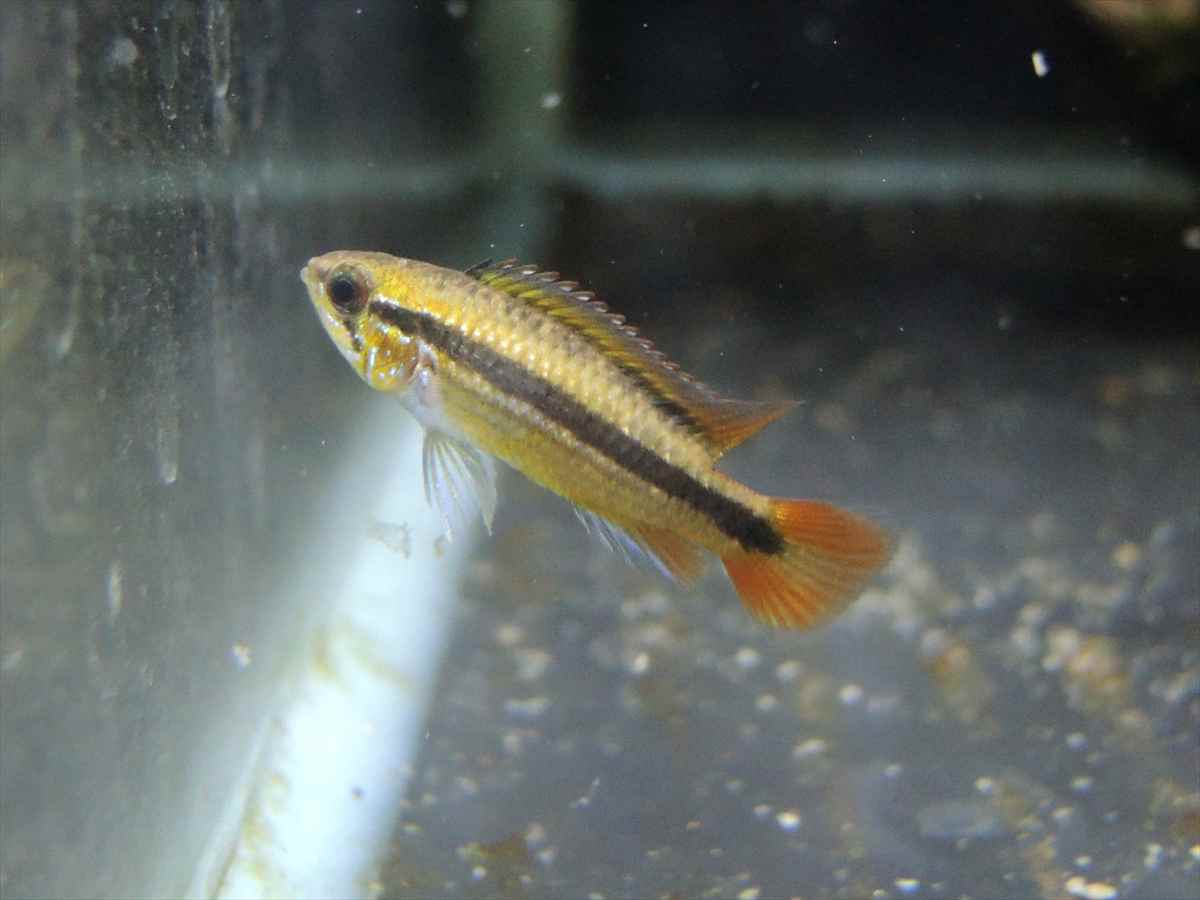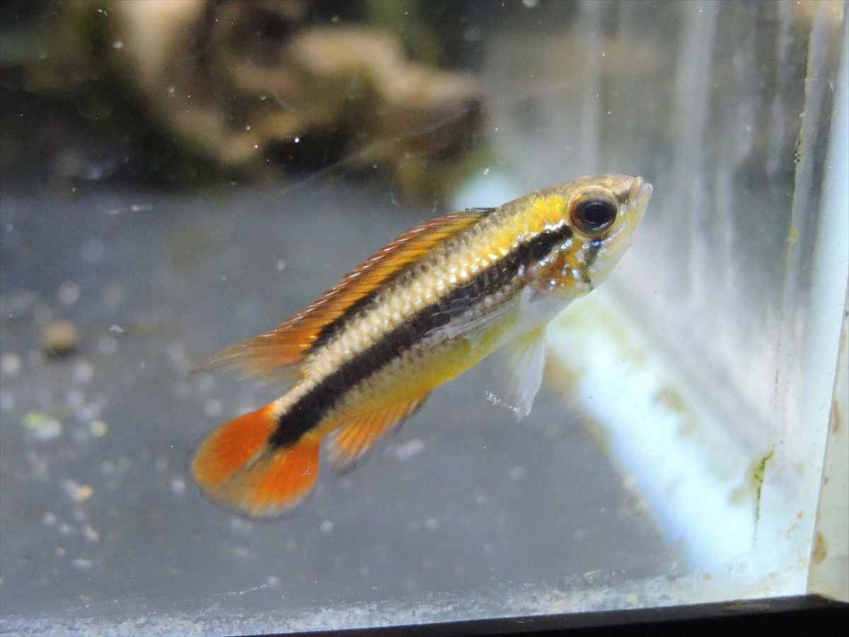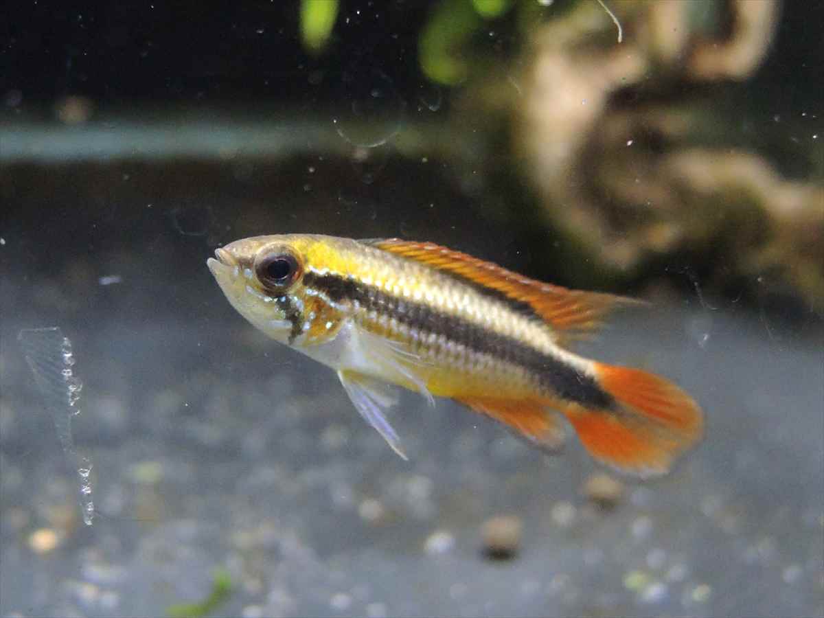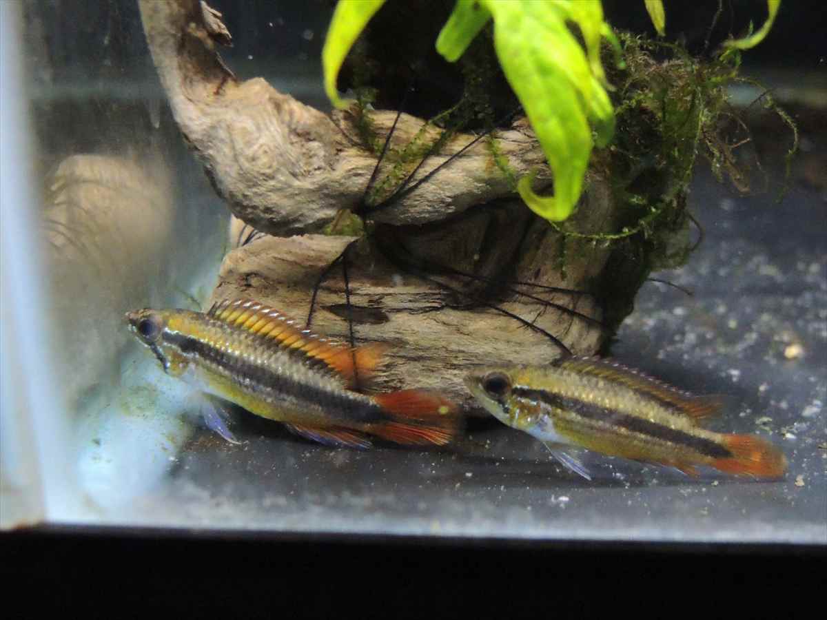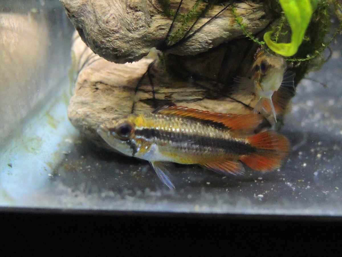 - アピストグラマ・アガシジィはアピストグラマ飼育入門種。濾過の効いた水槽であれば飼育は難しくありません。流木や産卵窟の天井に産卵しメスが子育てします。