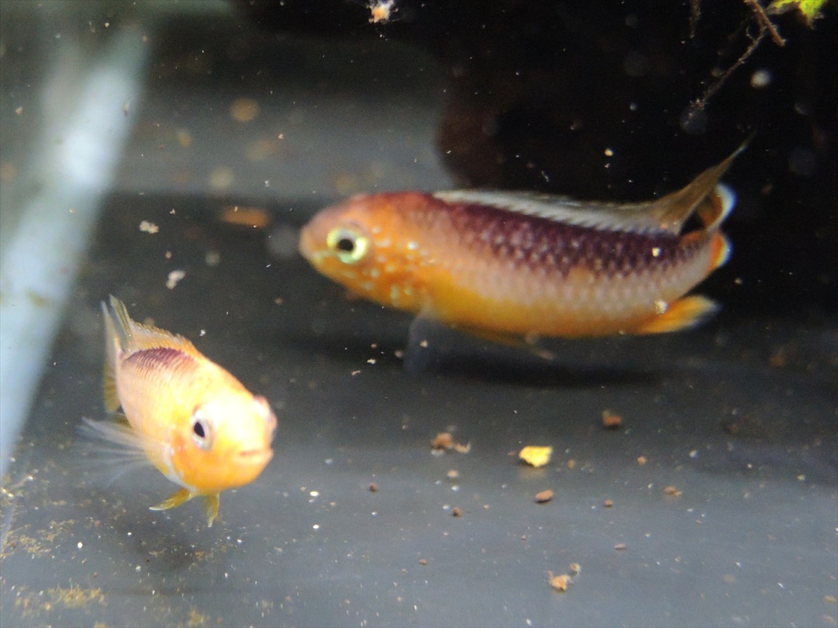 - アガシジィはアピスト飼育入門種。濾過の効いた水槽であれば飼育は難しくありません。流木や産卵窟の天井に産卵しメスが子育てします。
